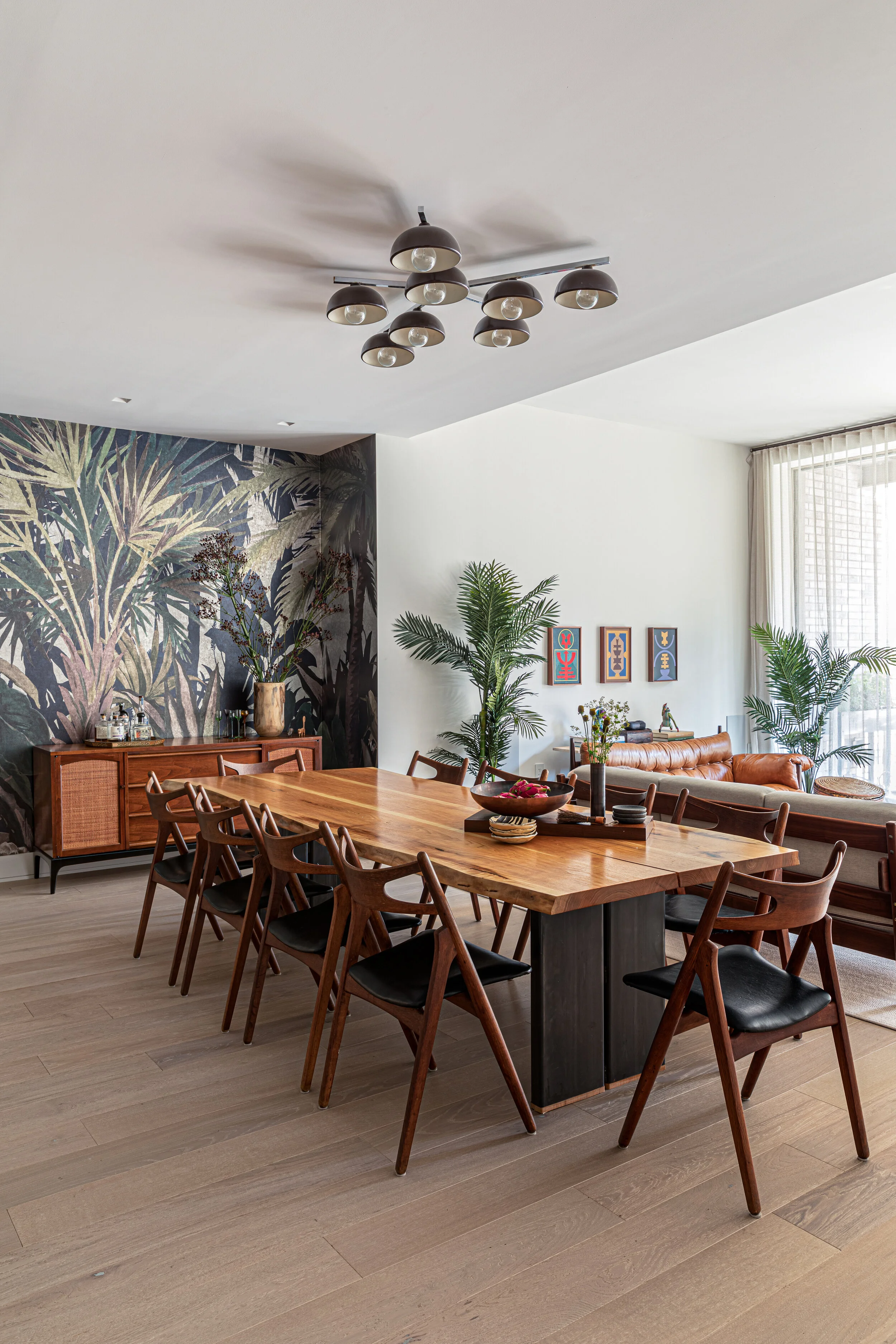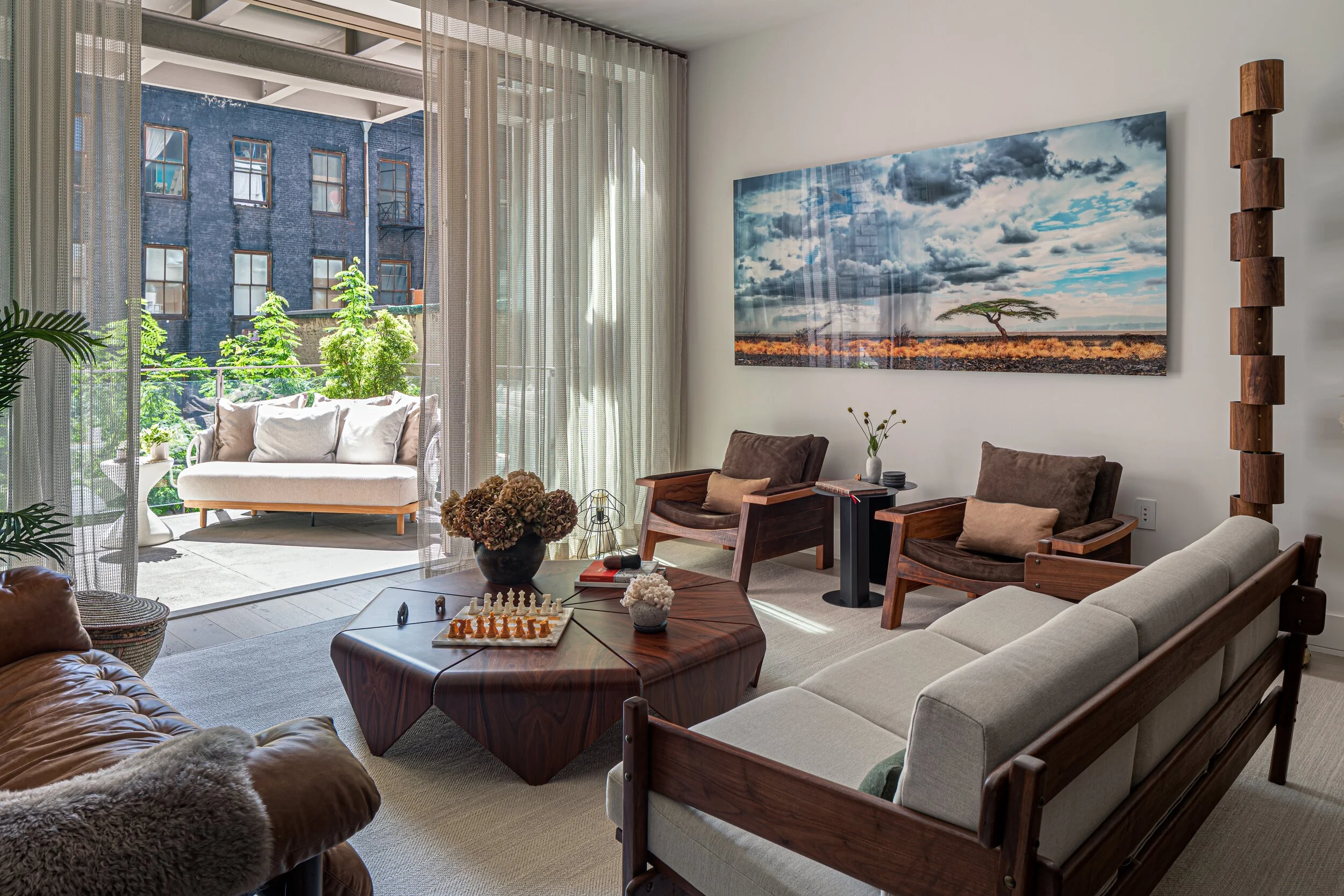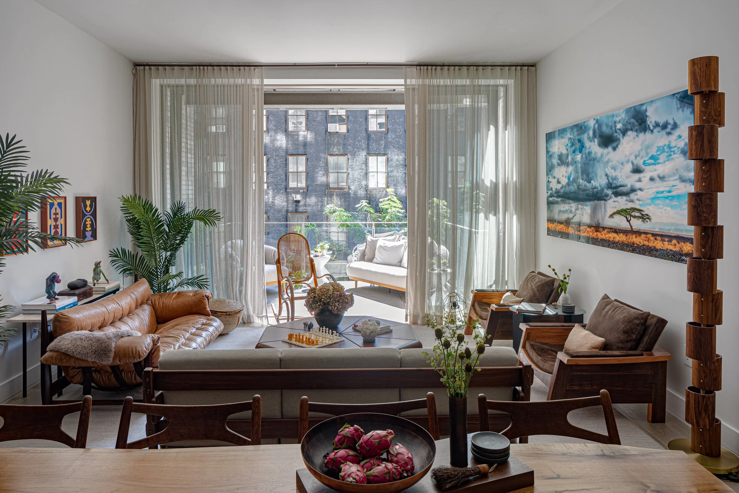 Located on a private, gated drive on iconic Great Jones Street, this award winning building by BKSK offers our clients an intimate, gracious lifestyle in the heart of Noho. Working with impeccable existing features, we renovated our client's 2k sq feet, 3 bedroom, 2.5 bath (2 ensuites) apartment which enjoys soaring 10' ceilings and a 125 sq ft private balcony. The space also includes 2 large, custom walk-in closets + 4 other closets, and in-unit washer/dryer. The space features a custom Arclinea kitchen with Gaggeneu & Miele appliances, direct elevator entrance, warm, teak bath details with steam shower and marble vanities. We brought in home automation for lighting, music & motorized shades. On-site amenities include an attended lobby, private gym, yoga studio, massage room, pool, hot tub & steam room, bike storage & storage unit. Our clients challenged us to go outside of our signature BS/D organic modernist style and instead wanted to emulate the feeling of a beautiful Brazilian home reminiscent of the one the lady of the house grew up in, but with updated vibes and a focus on entertaining. We sourced primarily authentic vintage handmade Brazilian pieces and landed some really incredible finds! The one word that comes to mind to describe the design of this home is: Collected. There is history behind every element we procured. We favored spiritual values and focused on our carbon footprint and the impact it had on the home. 85% of the pieces in the space are vintage, with some elements dating back to the early 19th century and into the early 70's. The remaining 15% are pieces from local artisans and makers in the Tri-state area - keeping to our focus on environmental and economic sustainability. Focused on the spiritual aspect of design, we choose to stick with earth tones while infusing colors often seen in Brazlian cultural, think orange, burnt reds and blues. There is harmony between each room, pulling layers from color and texture, if even in a subtle way.