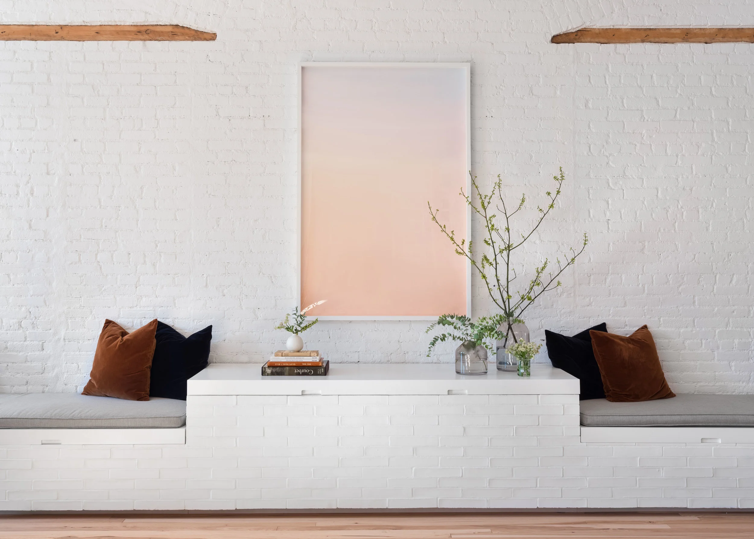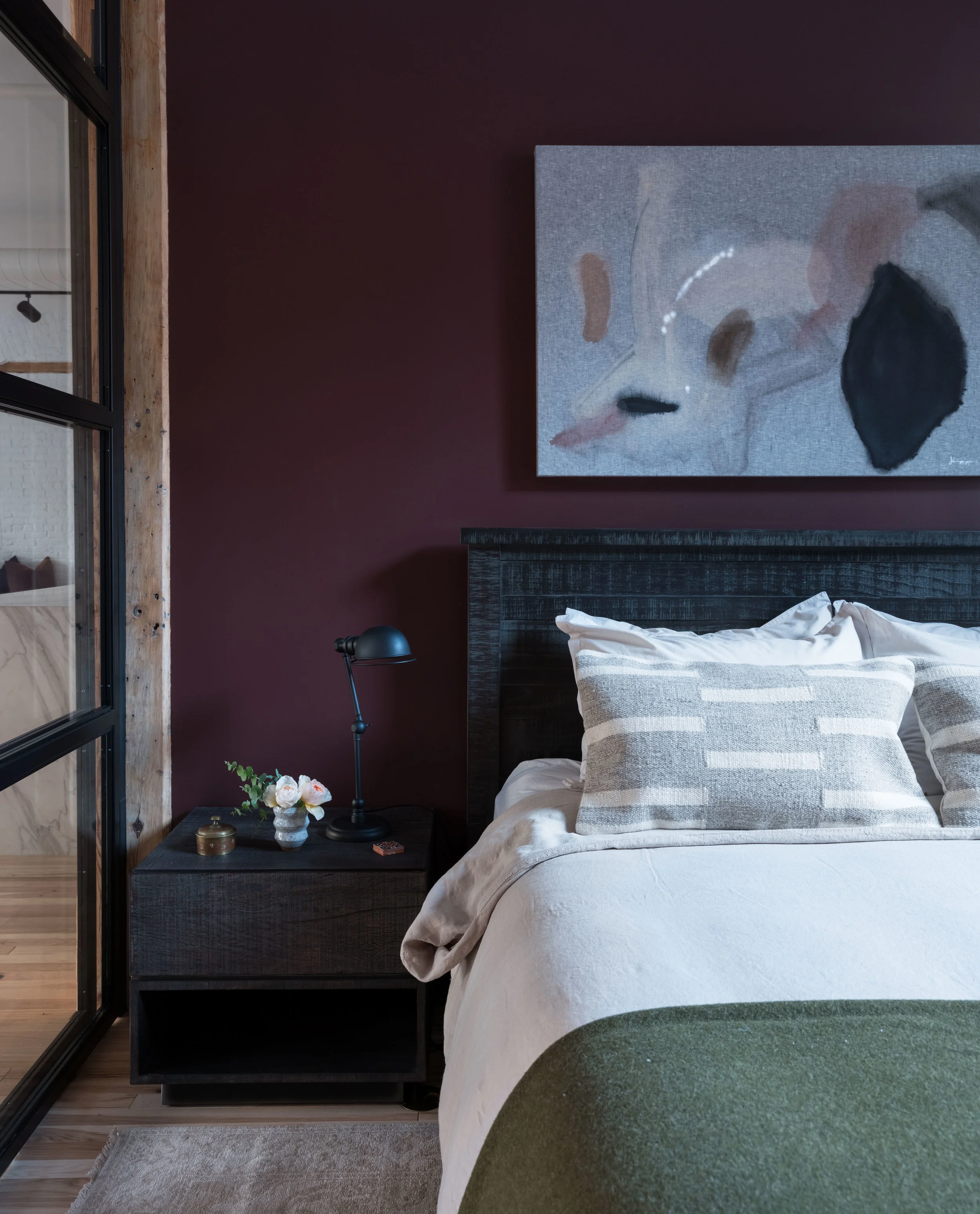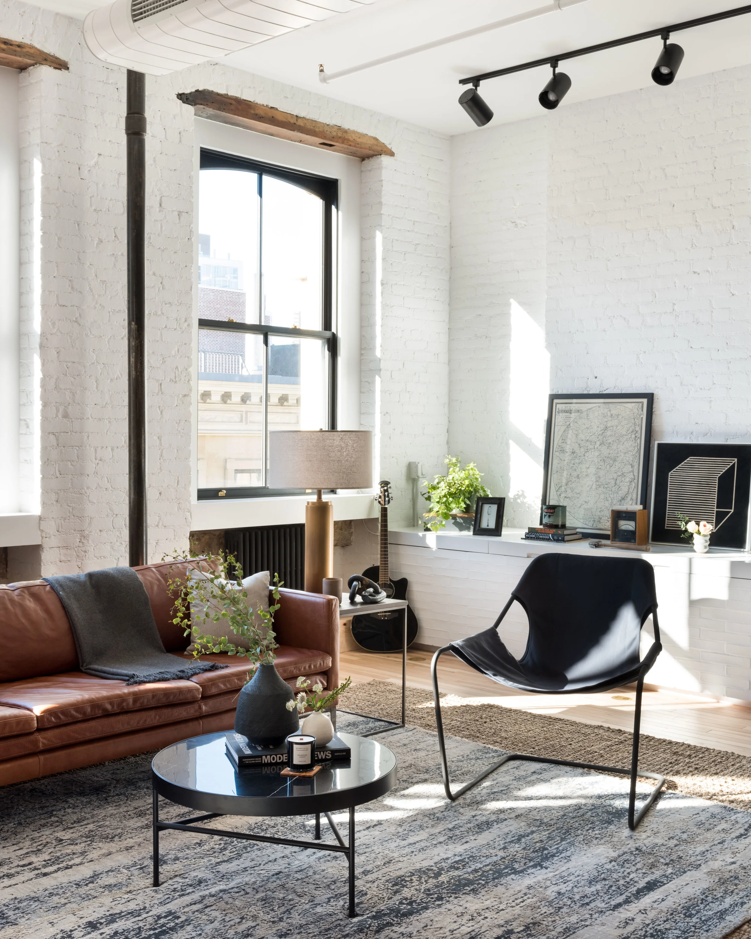 Tucked away in Soho overlooking lower Manhattan's skyline, a beautiful cast iron front is included with this landmark early 20th century building that predates steel's rise to supremacy. With bones to prove its authenticity, this loft is equipped with the original elevator opening directly into the living space appointed with original timber beams and columns, pine lentils above each window and refurbished radiators. Another dope client who has shifted the tech space gave us the platform to do what we do best. We managed the 2,800 square foot full floor renovation that required serious know-how on original architecture and how to refurbish elements we felt were critical to the authenticity of Soho’s design ethos. We salvaged all the brick and timber by carefully chipping away inches of stuko, sandblasted and repainted all of the radiators in a deep space black, introduced new floors, but kept the signature 2 ¼” width, stripped and exposed the stairwell and elevator door to its true steel form, and opened the space to be an adaptable, open concept unit, down from 7 small rooms. Blackened steel compliments the warm natural materials throughout while all of the furnishings were layered in as the build unfolded, including some elements our client procured while traveling. Ensuring our client's investment would be maximized, the plans are already drawn to add an additional bedroom and closets. The result is a spacious, welcoming home for enjoying a warm cup of tea and a nice book in the meditation room or for entertaining family and friends on a special occasion.