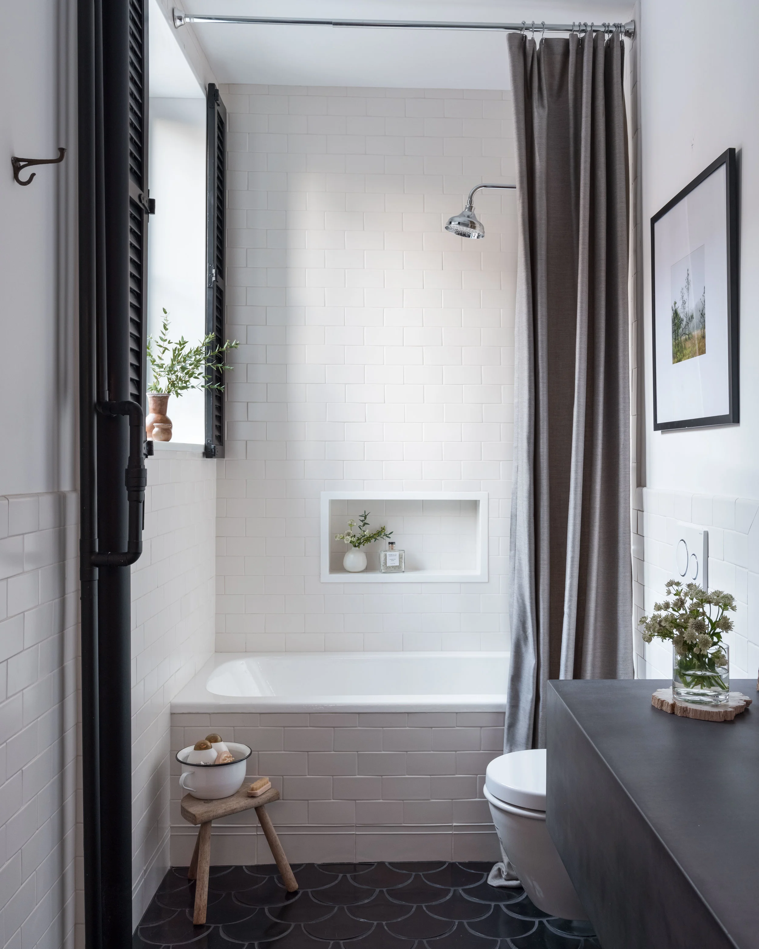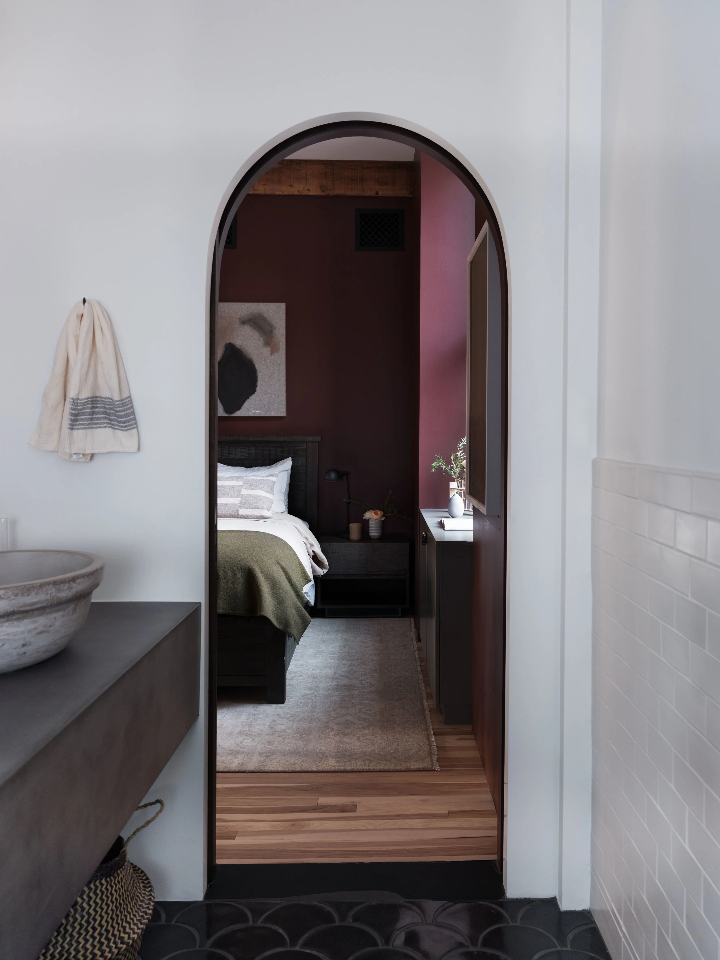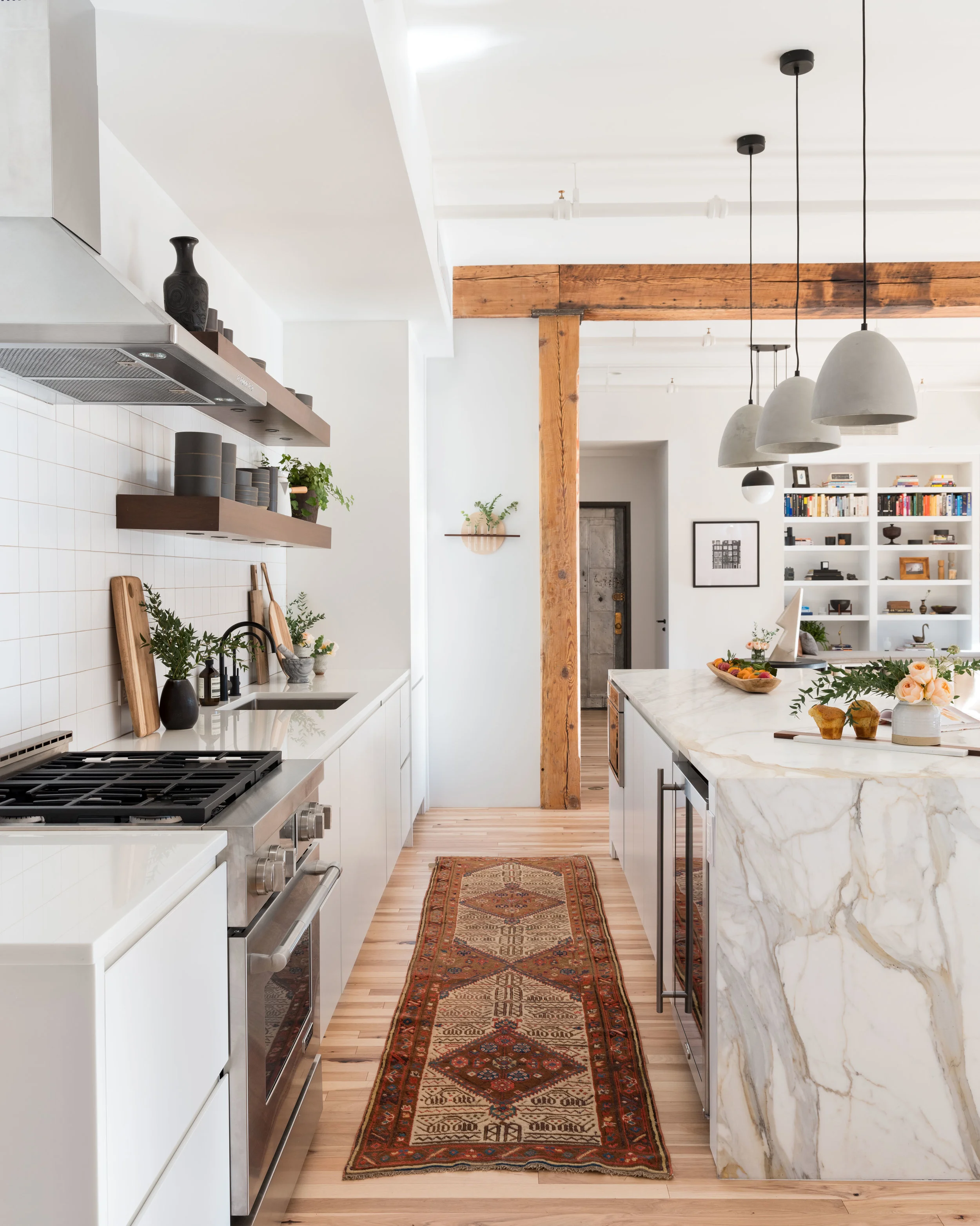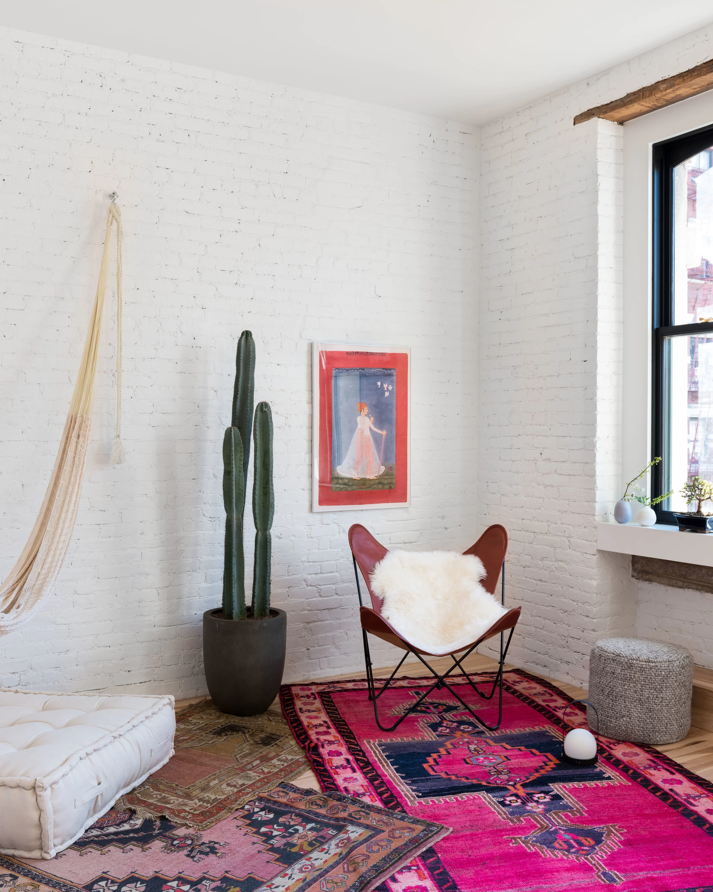Tucked away in Soho overlooking lower Manhattan's skyline, a beautiful cast iron front is included with this landmark early 20th century building that predates steel's rise to supremacy. With bones to prove its authenticity, this loft is equipped with the original elevator opening directly into the living space appointed with original timber beams and columns, pine lentils above each window and refurbished radiators. Another dope client who has shifted the tech space gave us the platform to do what we do best. We managed the 2,800 square foot full floor renovation that required serious know-how on original architecture and how to refurbish elements we felt were critical to the authenticity of Soho’s design ethos. We salvaged all the brick and timber by carefully chipping away inches of stuko, sandblasted and repainted all of the radiators in a deep space black, introduced new floors, but kept the signature 2 ¼” width, stripped and exposed the stairwell and elevator door to its true steel form, and opened the space to be an adaptable, open concept unit, down from 7 small rooms. Blackened steel compliments the warm natural materials throughout while all of the furnishings were layered in as the build unfolded, including some elements our client procured while traveling. Ensuring our client's investment would be maximized, the plans are already drawn to add an additional bedroom and closets. The result is a spacious, welcoming home for enjoying a warm cup of tea and a nice book in the meditation room or for entertaining family and friends on a special occasion.